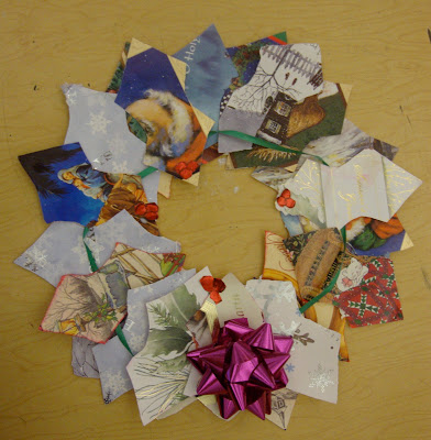 For Art Enrichment today, we made these great Recycled Christmas Card Wreaths! I originally got the idea from Goodhousekeeping, but had made some modifications to fit our budget.